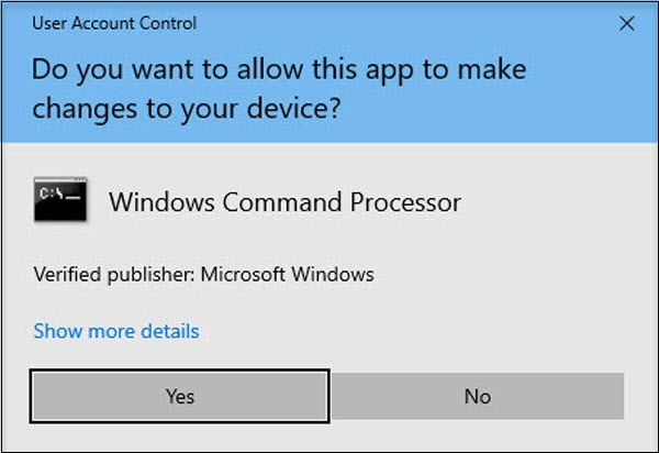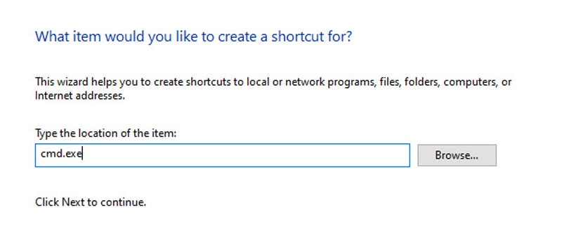 In the first dialog box, type cmd.exe for the program to run.