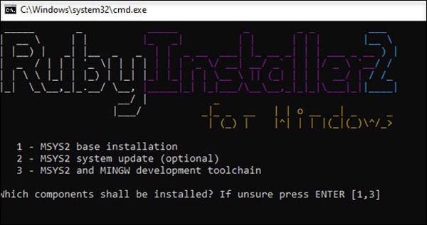 | Installation of the DevKit For the final step of the Ruby installation, use option 3 to install all applications for the DevKit. To complete this installation, press Enter. |