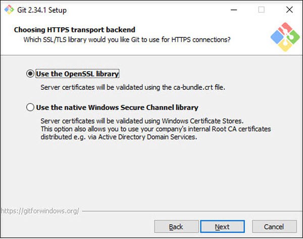 | Similar to SSH, SSL libraries are not available on Windows by default. The Secure Shell (SSH) subsystem depends on SSL libraries to establish secure and encrypted connections. For compatibility reasons, use the default option (OpenSSL). |