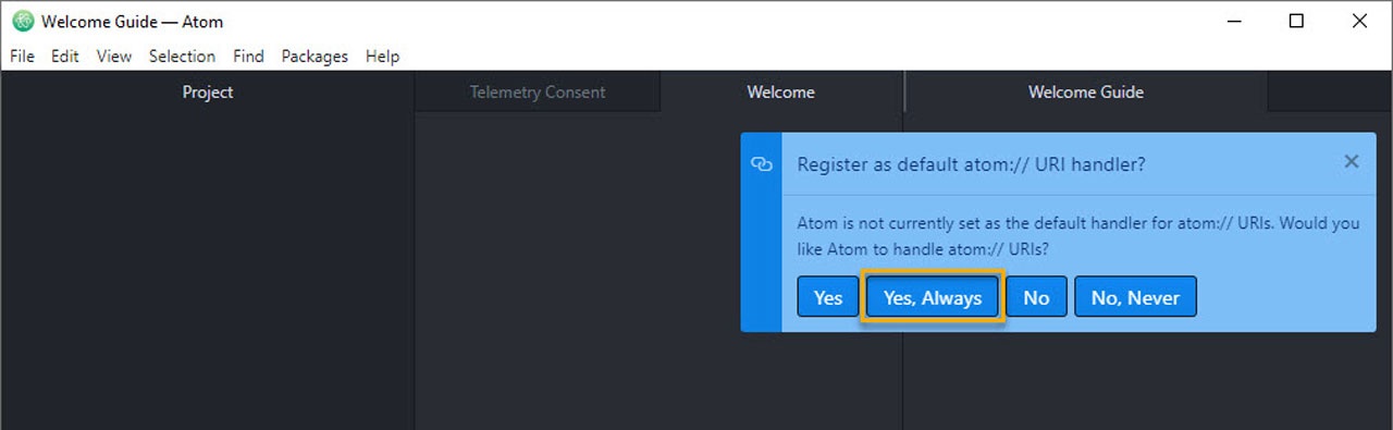 | The installation of the Atom editor is fully automatic. All the necessary settings are made during the installation and can then be adjusted later should this be necessary. After completing the installation, the editor is started, and a few settings have to be made. |