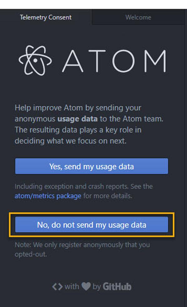 | Lastly, it is on you to send usage information back to the makers of Atom over an active Internet connection. I’m using Atom on Windows mainly for J1 projects, and the editor’s setup is very basic. I expect less relevant information to develop Atom as a product and reject on that. But, it is on you! |