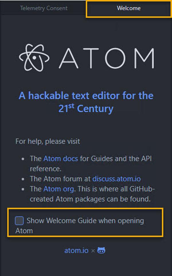 | As an option, a welcome guide tab can be shown if you start a new editor instance. For the first time using Atom, this might be helping somewhat. A lot of excellent articles about using Atom are available on the Internet. It is on you to leave this enabled. You can disable the welcome guide at any time. |