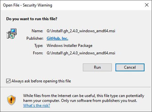 To download the installer, go for Gihub CLI Home or download the latest installer (version of 01/22) for Windows from here Installer v2.4.0.