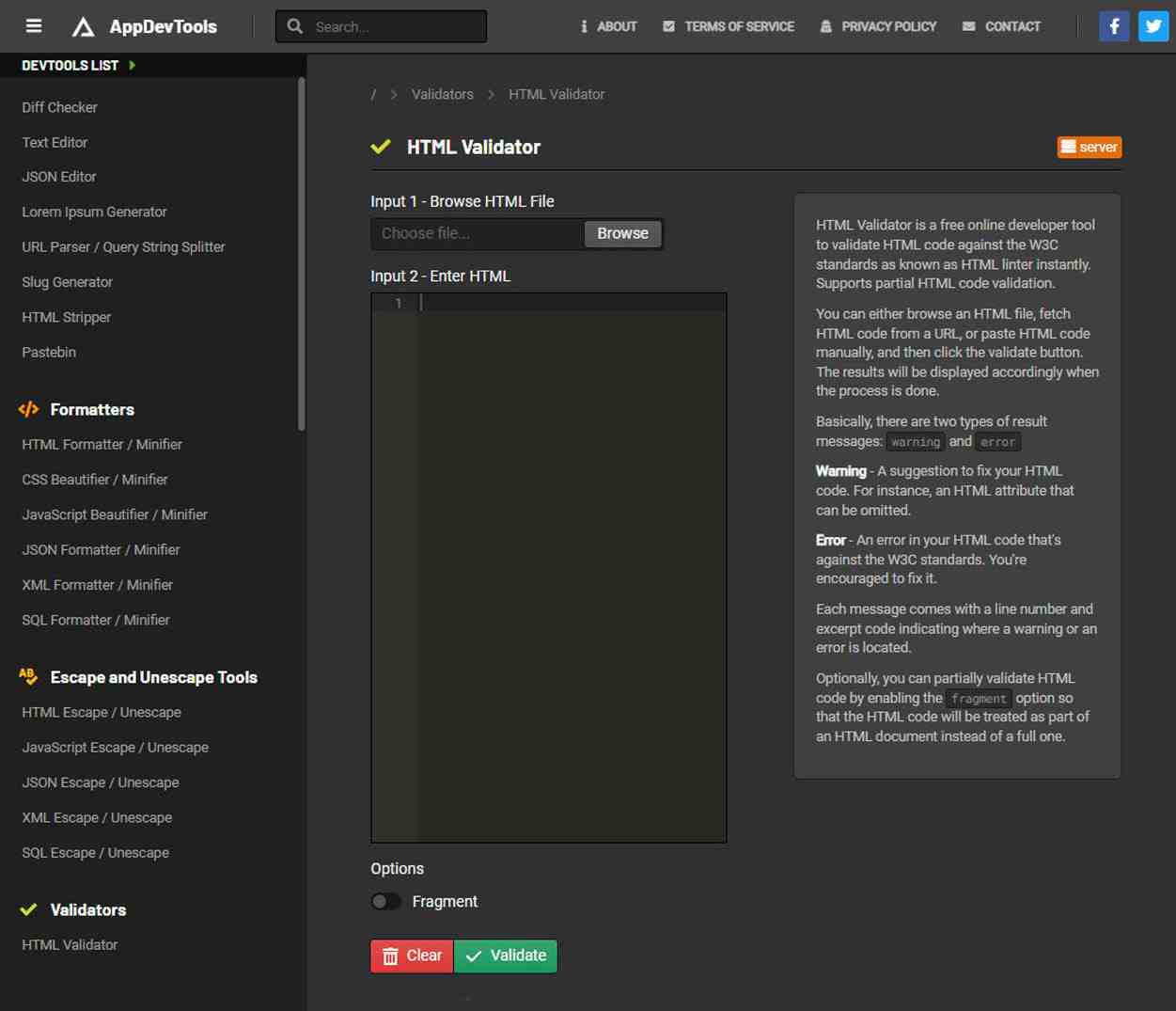 The HTML Validator at appdevtools.com is also based on the WHATWG's Nu Html Checker. As a special feature, this validator allows validating of only parts of the HTML code. To do this, activate the Fragment option. The HTML code is then treated as part of an HTML document, not a complete one.