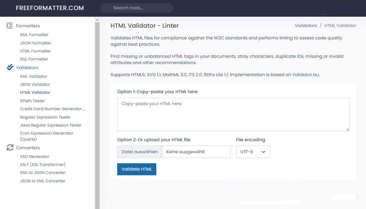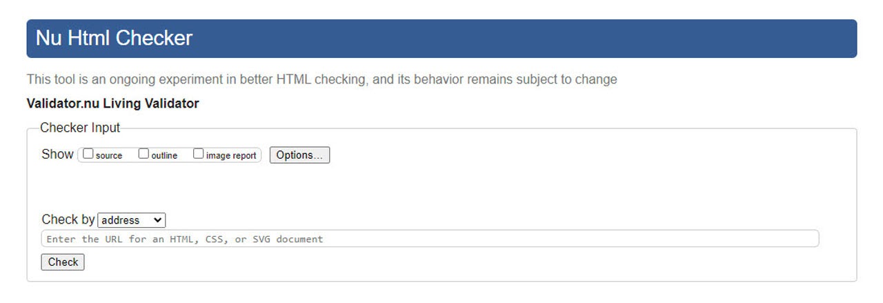 The Nu Html Checker is based on the same underlying engine as the HTML parsing algorithm used in modern web browsers. It provides an accurate and up-to-date analysis of HTML documents, considering the evolving nature of web standards. This validation tool is based on the HTML validator developed by Henri Sivonen. It tests for correctly using HTML, CSS, and graphics in the SVG file format. However, the document type definition (DTD) must be tested here. The Nu Html Checker is open source and is being further developed as a project hosted at Github.